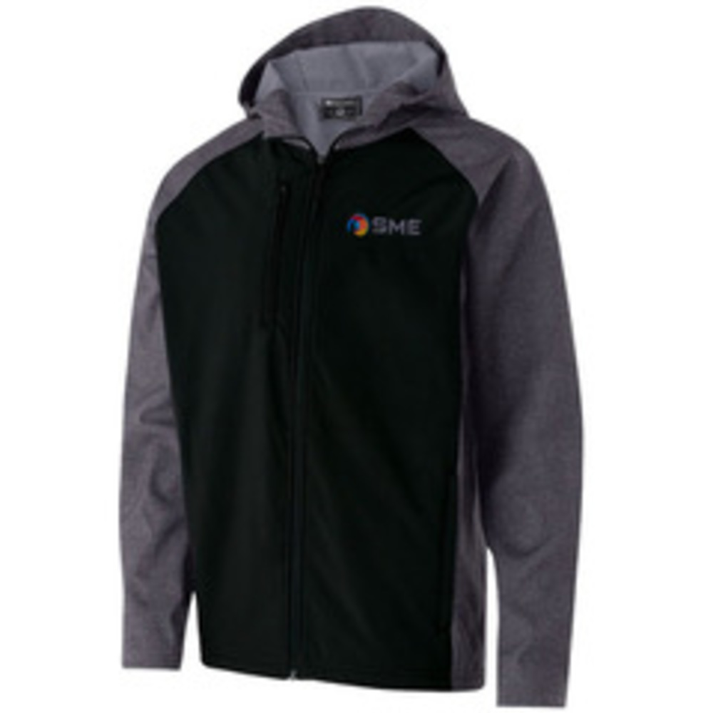 sku: SME108Lightweight, soft shell outer fabric in 96% polyester, 4% spandex bonded to brushed back polyester * Sleeves, hood and panels have Tech Print pattern detail * Woven label * Front zipper * Adjustable hood with drawcord * Dual front chest zippered pocket * Dual inside pockets * Internal storm cuffs for weather protection * Front zippered pockets * Open bottom with adjustable elastic hidden drawcord * Dropped tail